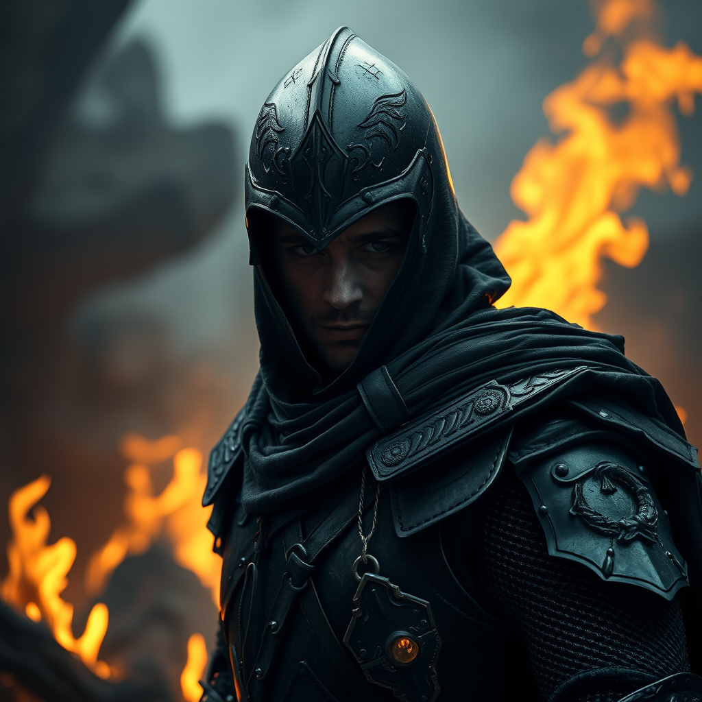 Half-body portrait of a dark knight emerging from the embers, embodying a villainous aura with a focus on intricate details and a palette of muted colors. The knight gazes directly at the viewer, creating a profound emotional connection. The scene captures a blend of photographic realism and digital painting artistry, emphasizing soft lighting and exceptional detail. The atmosphere is haunting yet captivating, showcasing the knight's transition with grace. Words, signatures, or any extraneous elements are absent, ensuring the focus remains on the artistry and narrative essence.