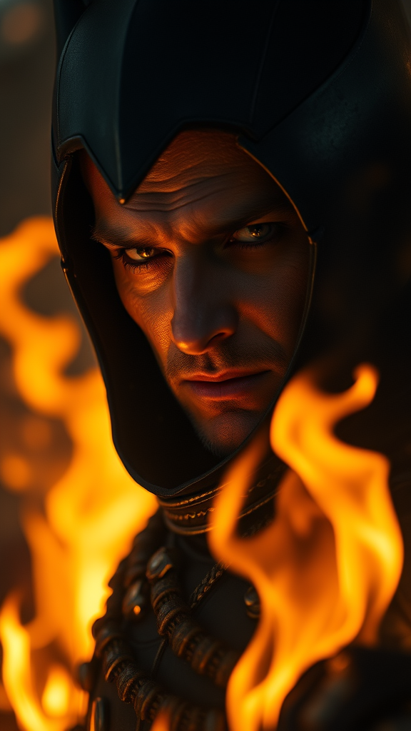 Half-body portrait of a dark knight emerging from the embers, villainous aura, surrounded by flames, sharply focused, intricately detailed with muted tones, making eye contact with the viewer, capturing a photographic realism, conveying emotional depth, rendered with soft lighting, 8k resolution, with extreme detail, digital painting style, subtle imperfections, slight jpeg artifacts, embracing raw and gritty aesthetics, emphasizing a uniquely expressive face and presence, personal nuance, devoid of external distractions or embellishments.