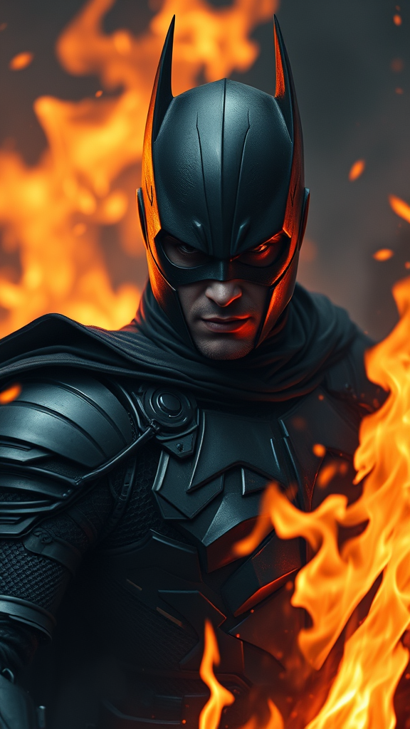 Half-body portrait of a dark knight emerging from the embers, villainous presence, engulfed in fire, sharply focused, richly detailed, subdued hues, engaging the viewer, photographic realism, emotionally impactful, exceptionally detailed, gentle lighting, 8k resolution, digital painting with fine details, avoiding excessive text, maintaining image quality, flawless portrayal, seamless anatomy, precise proportions, avoiding extra or missing limbs, preserving natural form, free from distortions, clear visage, intact figure, without signatures or watermarks, atmospheric setting, vivid expression, conveying depth and intensity.