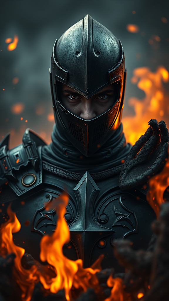 Half-body portrait of a dark knight emerging from the ashes, embodying a villainous aura with elements of fire; the image is in sharp focus, showcasing intricate details with muted colors. The knight gazes directly at the viewer, capturing a sense of realism and emotional depth. The scene is bathed in soft lighting, emphasizing extreme detail in an 8k resolution digital painting style. The knight is enveloped in a swirling mist of embers, enhancing the burning atmosphere while adding subtle complexity without overwhelming the composition. Despite the intensity, the portrait maintains realism in anatomy and proportions, focusing on the knight's intense expression and the haunting beauty of the setting. Absence of text and unnecessary digital artifacts ensures the image remains authentic and visually captivating, with careful attention to detail and design, avoiding any elements that could detract from the overall impact.