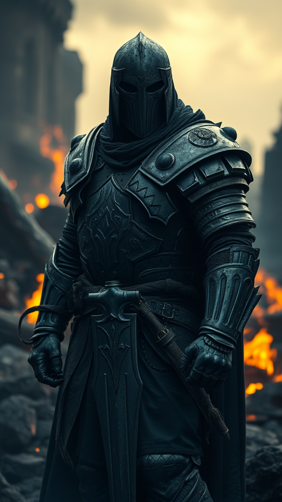 Half-body portrait of a dark knight emerging from smoldering ruins, embodying menace and power. In a setting of glowing embers, the knight gazes directly at the viewer, exuding an aura of haunting intensity. The scene captures the intricate, weathered details of armor, set against a backdrop of muted colors that evoke a somber mood. The soft, ambient lighting adds depth, enhancing the emotionally profound atmosphere. This digital creation is highly detailed with a focus on realistic textures and intricate design elements, bringing the fictional character to life with vivid clarity. Despite the profound darkness, a delicate balance of light and shadow invites a captivated exploration of this dark and enigmatic figure.