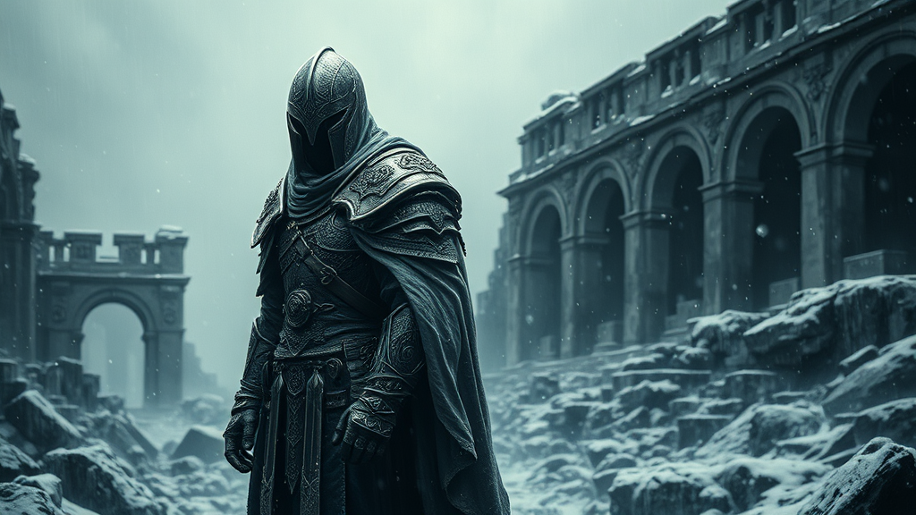 Half-body portrait of a fearsome warrior in intricate armor, legendary and ethereal, with a ghostly presence. The cloak is tattered, the face obscured, standing solitary among desolate ruins. Snow falls gently in a stormy backdrop, creating a brutal yet epic ambiance. The scene is breathtaking, painted digitally with influences from Eugene de Blaas and Ross Tran. Dramatic, moody lighting enhances the dark misty atmosphere, exuding calm elegance. Crafted in a romantic cinematic style reminiscent of Greg Rutkowski’s work, the piece is highly detailed, unforgettable, and captures a sense of mystery. The image holds a dynamic quality, while retaining a touch of artistic abstraction and surrealism, avoiding visual distractions such as text, logos, or noticeable distortions.