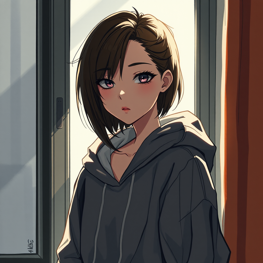 half body portrait of a striking girl by a window, wearing a cozy hoodie, dynamic play of light and shadows, sultry expression, anime-inspired, comic style, high detail, muted color palette, digital painting, complex details, text elements, intentionally degraded quality, jpeg artifacts, intentionally flawed design elements, surreal, exaggerated anatomy, blurred elements, distorted proportions, abstract limbs and features, elongated neck, presence of various marks like signature or watermark, composition intentionally disordered, exploring unconventional aesthetics.