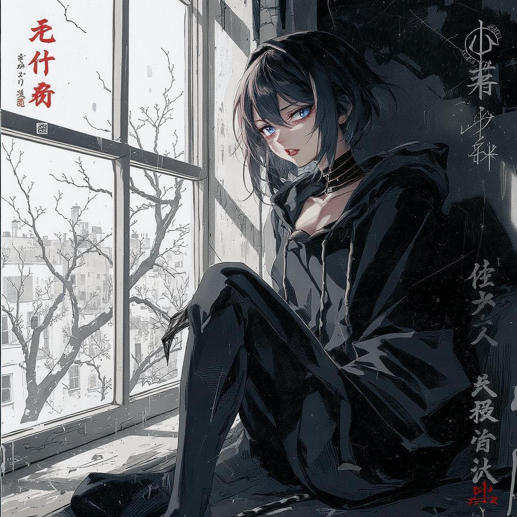 Half-body portrait of a striking girl by a window, wearing a hoodie, dynamic lighting casting shadows, sultry mood, anime style with comic influences; rendered in digital painting with muted colors, intricate details, 8k resolution, textured and rough. Despite intentional artistic flaws—such as jpeg artifacts, blurred edges, and deliberately poor line work—the piece intrigues. Features like distorted proportions, abstract anatomy, and surreal elements like extra limbs and elongated neck add a bizarre charm. Symbolic watermarks, signatures, and obscure logos hint at deeper narratives. A study in imperfection, embracing duality and complexity.