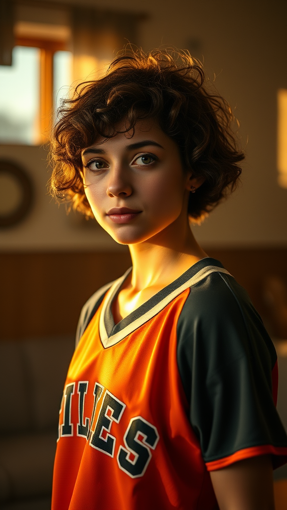 Half-body portrait of a stunning American girl with short, curly hair wearing a vintage sports jersey, indoors, basked in the soft glow of golden hour, featuring dramatic shadows, photorealistic style, reminiscent of Kodak Portra 800 film, crisp 8k resolution, with an aspect ratio of 9:16 in version 5, capturing a serene and reflective expression.