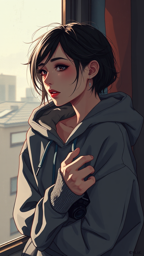 Half-body portrait of a stunning girl gazing out a window, enveloped in a cozy hoodie. The scene is bathed in dynamic lighting, casting intriguing shadows that amplify her sultry demeanor. Rendered in anime with a comics-inspired aesthetic, the digital painting features an 8k resolution with a rough, muted color palette. Depth and intricacy are paramount, while elements like text, low-quality artifacts, and unrefined details add character. The portrayal intentionally incorporates artistic imperfections, with surreal and exaggerated features such as irregular anatomy, extra limbs, and elongated neck contributing to its unique style. Deliberate flaws in hand and facial depiction create a distinct, abstract visual narrative, while notable elements like a camera, signature, or watermark subtly blend into the composition.