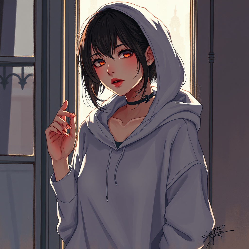 Half body portrait of a stunning young woman by a window wearing a hoodie, with dynamic lighting and dramatic shadows casting a sultry mood. Captured in a style blending anime with comic art, the scene is rendered in 8k resolution with rough, muted colors for a digital painting that is highly intricate. Despite the artistic quality, there are deliberate imperfections like jpeg artifacts creating a raw aesthetic with elements that appear duplicated, morbid, or mutilated. The depiction might include poorly drawn features such as hands and face, with mutations like deformed or blurry areas, suggesting a sense of dehydration and flawed anatomy leading to bad proportions. Additional limbs or cloned features might appear, producing disfigured and gross proportions, while some limbs might be missing entirely. There's a distorted neck, and the image is overlaid with elements like a watermark or signature, potentially cut off or censored, heightening the theme of intentional imperfection amidst artistic expression.