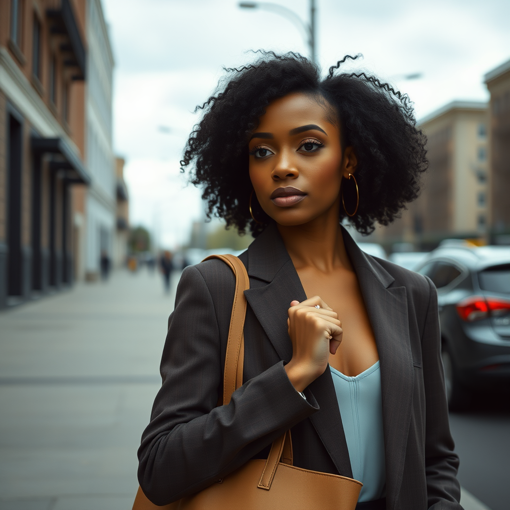Half body shot of a striking African-American woman in a stylish blazer holding a tote bag, standing on an urban street, with her curly hair framing her face elegantly, under an overcast sky. She sports subtle, refined makeup that complements her features, with dramatic, moody lighting adding depth to the scene. The image is photorealistic, captured in 8k resolution, evoking the rich tones and textures of Kodak Portra 800 film, with a slightly narrower aspect ratio of 8:16 to enhance the vertical composition.