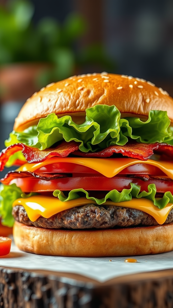 Hamburger with crispy bacon, fresh lettuce, juicy tomato, and melted cheese in a vibrant promotional image showcasing the burger in hyperquality, with a focus on a product shot in full color and an extreme render, highlighting a mouthwatering appeal.