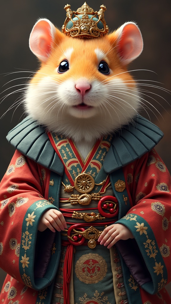 View this AI-generated image featuring a majestic hamster clad in the resplendent attire of a feudal japanese emperor captured in a masterfully centered portrait the piece is marked by intricate detailing vibrant colors and breathtaking beauty with precise linework forming a cinematic composition in