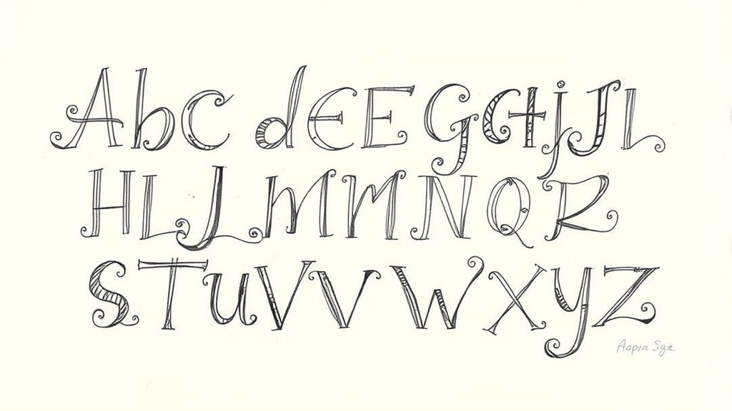 Hand-drawn alphabet sketched on paper, artistically styled with intricate details and whimsical flourishes.
