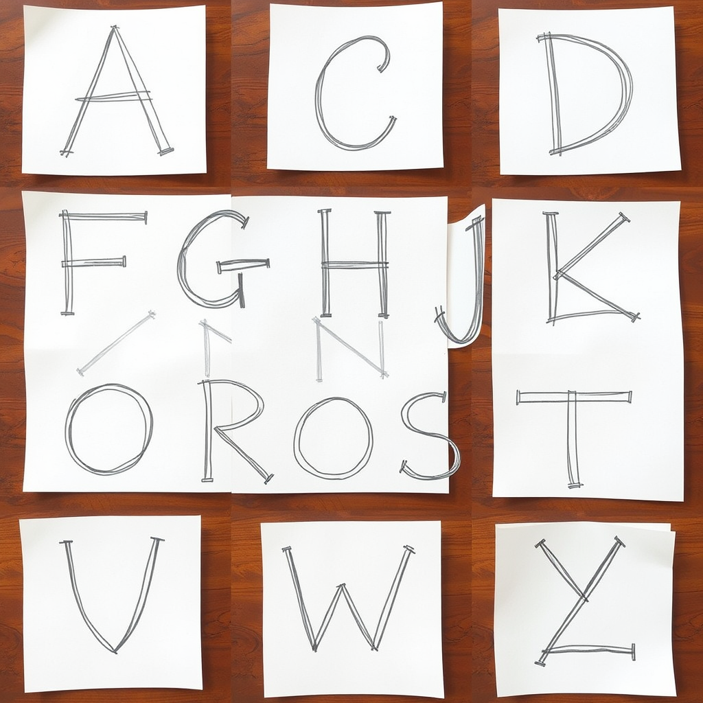 Hand-drawn sketched alphabet on paper, each letter uniquely stylized with creative flair.
