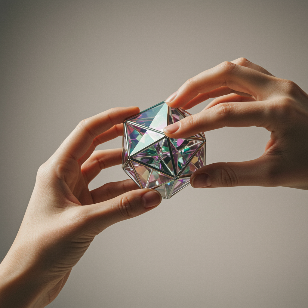 hands delicately manipulating a geometric polyhedron, 8k resolution, intricate details with subtle creative flair, soft light highlighting the complex facets and shadows, capturing the essence of curiosity and exploration