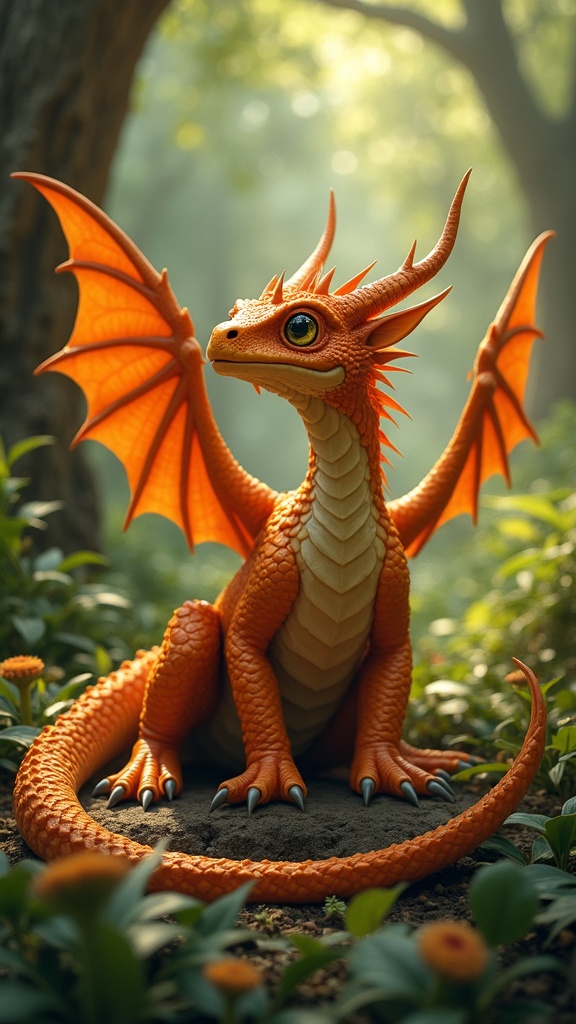 View this AI-generated image featuring a strikingly handsome and charming orange dragon rests within a vibrant lush forest this d d character is set against a richly detailed background with an air of fantasy and magic gently infusing the scene its realistic textured skin shimmers under dappled sunl