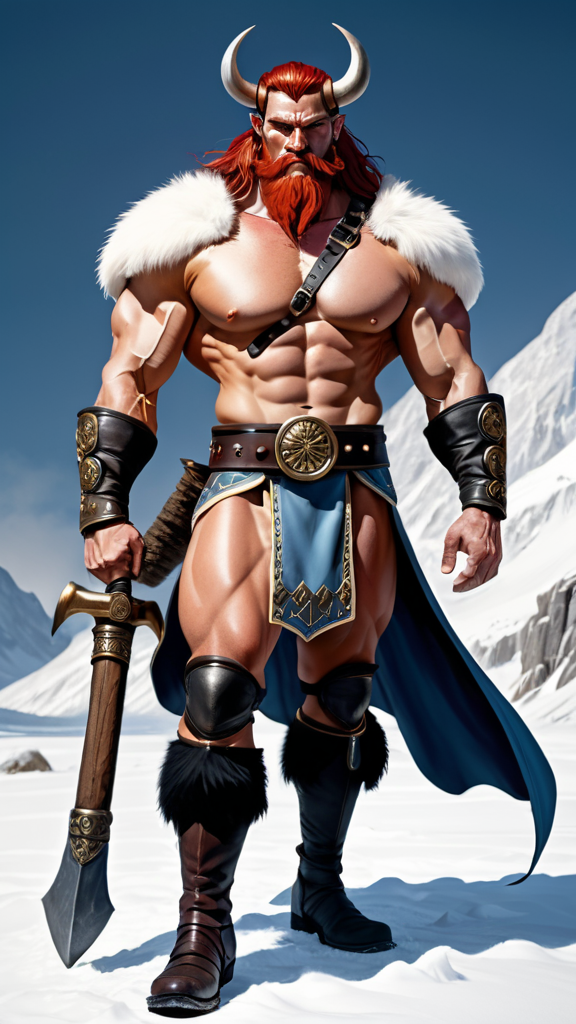 handsome troll with {{pale blue skin}}, warrior. Tall, strong, muscular, sinewy, broad chested, wide back, narrow waist, bodybuilder. Short dark red hair, mullet with middle-parted bangs. White horns curved upwards from the front of his temples. Handsome face, Icy blue eyes, strong brow and jaw. Dark red beard, neatly trimmed with sideburns. Golden pauldrons trimmed with black on broad shoulders. Black leather bondage harness on his bare chest, dark blue tribal tattoos on his chest. Black leather bracers on strong arms. White fur loincloth covering his girthy loins, exposing strong muscular legs, a golden Viking styled belt trimmed with black around his waist. Knee-high black leather boots with white fur tops. A Scarlet-red short cape with golden-yellow Viking designed trim around the edges. He wields a giant Viking war axe. Full body pose, axe raised in warrior stance.