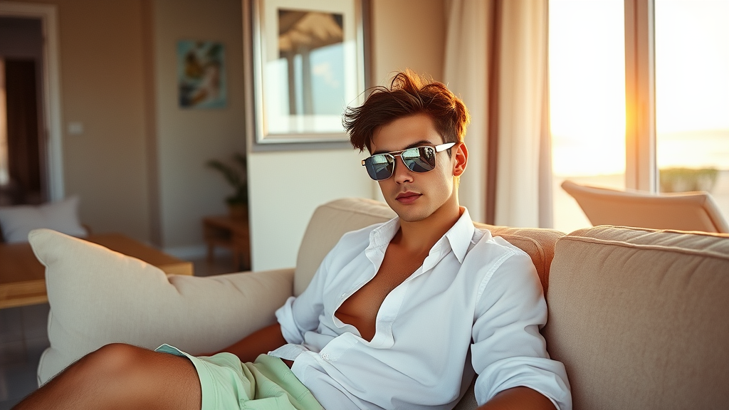 Handsome young man in pastel-colored board shorts and a crisp white linen shirt, relaxed on a plush couch in a warm beach house, eyes squinting behind trendy mirror-finish sunglasses, photo taken on an iPhone 13 Pro in a reflective silver frame hanging on a wall, messy dark hair tousled, soft focus and analog aesthetic with camera shake, Kodak Gold 200 film, f2.2, warm golden light spilling through the window at sunset, cropped 2:3 aspect ratio.