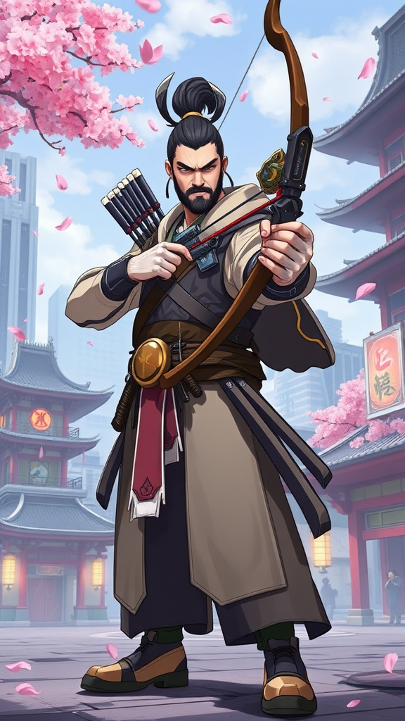 Hanzo from Overwatch standing in a full-length pose, exhibiting an intense expression as a key light accentuates his facial features and traditional attire. He is in a poised archery stance, set against a backdrop of the game's futuristic yet culturally rich environment, featuring Japanese architecture, modern cityscapes, and cherry blossoms. The scene is depicted in a medium-wide shot, blending styles from Anime, Cartoon, Manga, CGI, Video Game, and Painting, with creative additions like a subtly glowing bow and slightly enhanced cherry blossom petals swirling in the air.