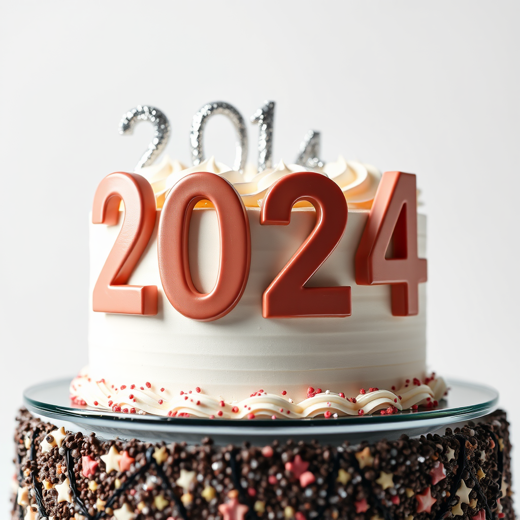 Happy New Year's 2024 cake, close-up portrait, ultra-realistic, captured with a standard lens range of 35mm-85mm, utilizing natural lighting, shot on a Canon SL3 DSLR, set against a clean white background. Exemplary quality, showcasing high-resolution graphics with cinematic appeal. Rendered as a digital painting, the image is immaculately detailed, boasting 8k and 4k HD clarity with dynamic lighting. Featuring intricate details, the composition is flawlessly arranged and optimized for 32K HD brilliance. Subtle creative nuances enhance the core concept of celebration and elegance.