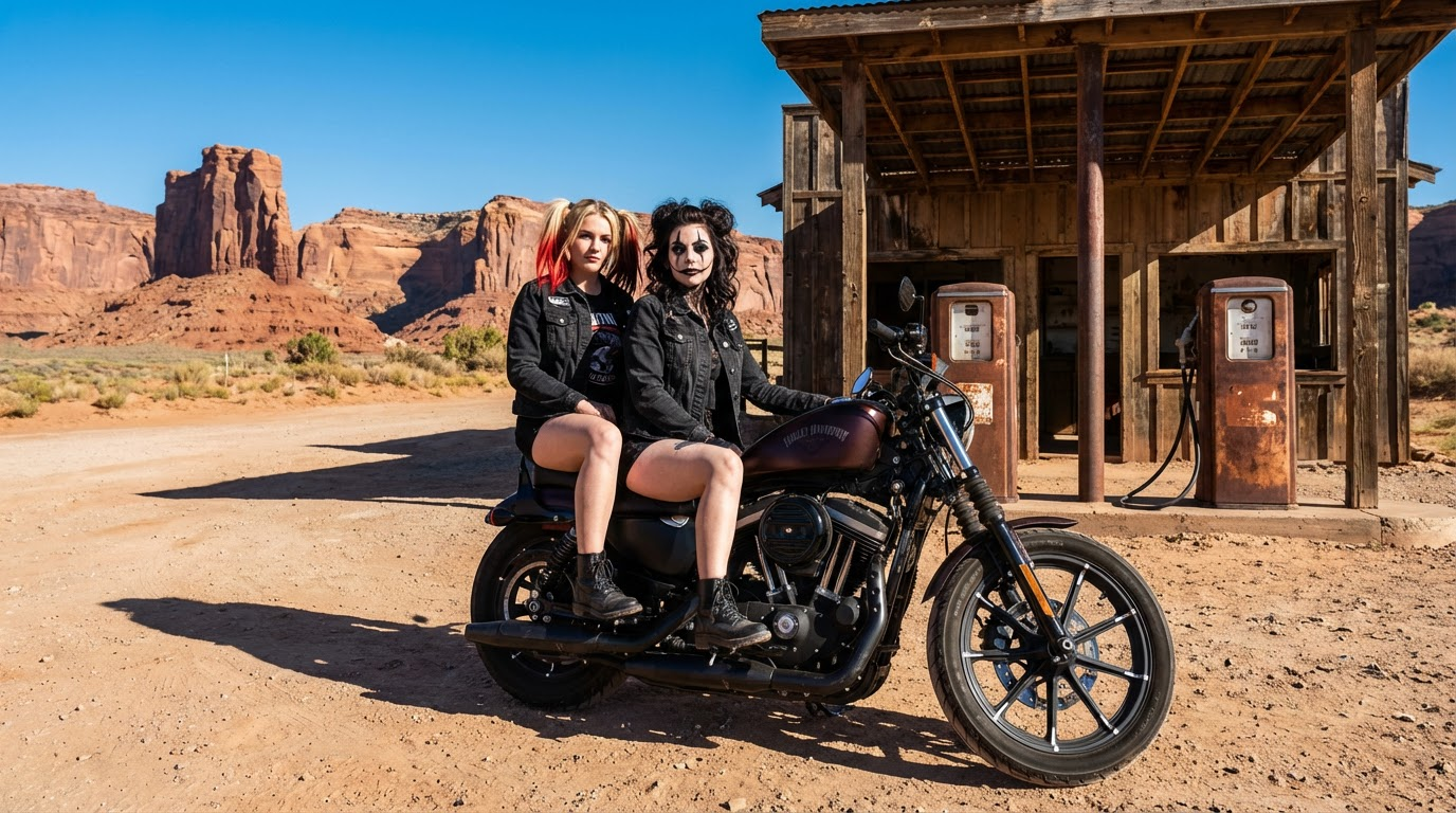 Two women, one resembling Harley Quinn and another with gothic clown makeup, pose on a black Harley Davidson motorcycle. They are in front of a rustic, abandoned gas station in a desert landscape with red rock formations under a clear blue sky. The scene is captured with photorealistic detail and...