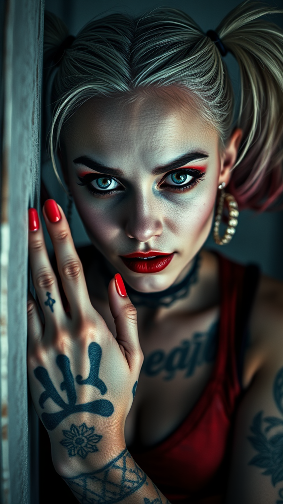 Harley Quinn, eerie expression, intense gaze, confined space, intricate tattoo, engaging with viewer, portrait style, vivid photography, detailed skin texture, lifelike, ultra-realistic, full-length composition, RAW color art with high fidelity, striking piercings, soft diffused lighting, shallow depth of field for focus, hyperrealism, cinematic lighting effect, potential text distortion, cropped image issues, low resolution artifacts, subpar quality, potential jpeg distortions, peculiarities, duplicate imagery, dark and unsettling themes, exaggerated features, possible image blurring, compromised anatomy, disproportionate elements, possible extra or missing limbs, unique hand formations, unexpected facial details, ethereal and unworldly proportions, possible watermark intrusions.