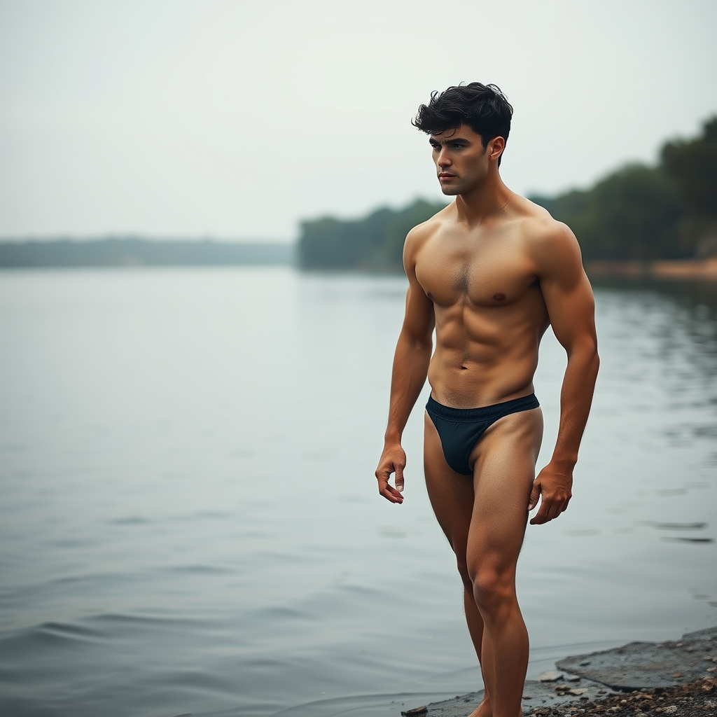 Harmony by the lake, elegant male model, short dark curly hair, round facial features, natural body hair on chest and abdomen, highlighting texture, showcasing feet, captured with a Nikon camera, exceptional male physique, sharply focused, standing confidently, well-defined muscles, stunning composition, dynamic pose, inspired by John Collier's style, subdued color palette, intricately detailed, strikingly handsome man.