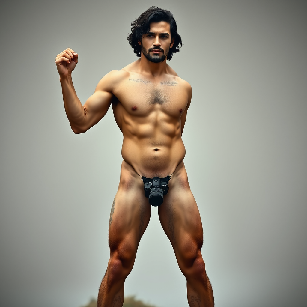 Harmony of nature, elegant figure, short black wavy hair, natural underarm hair, soft round features, rugged chest, natural stomach, bare feet, Nikon camera, ideal masculine form, crisp focus, standing strong, athletic build, stunning composition, dynamic posture, inspired by the artistry of John Collier, subdued tones, intricately detailed, strikingly handsome, captivating presence.