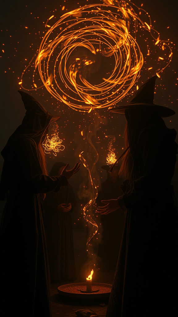 Harnessing the mystique of motion-capture elements, envision a coven casting an immense magic spell through witchcraft, with embers of light swirling in a lightcore aesthetic. The scene unfolds with intricate details and a realistic touch, amidst the glow of light pollution under dramatic lighting. A hyperrealistic backdrop echoes with the essence of Blocksberg folklore, all captured in cinematic quality with UHD and 8k resolution. The dark aesthetic envelops the ambiance, creating a seamless blend of CGSociety artistry. The composition encapsulates the essence of a hyperdetailed light-casting ritual.