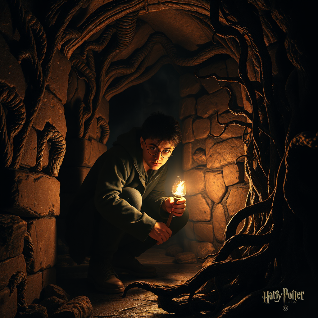 Harry Potter crouches in the dungeon, the dim, flickering torchlight casting eerie, dynamic shadows across the stone walls. His glasses glint ominously, partially obscured by cobwebs and dust. The scene is charged with a sense of heightened reality—every detail meticulously rendered, down to the glistening moisture on the cold stones. Around him, the air feels alive with an unsettling, mystical energy, the kind that makes the hair on the back of your neck stand up. This is an extreme nightmare realm, where the magical takes on a twisted, creepy form, echoing the dark imagination of artists like H. R. Giger, Jean Ansell, and Justin Gerard. Sinister roots and tendrils seem to pulse with a life of their own, intertwining with Gothic architecture that looms like a grotesque shadowy maze. The overall atmosphere is both beautiful and terrifying, a testament to the warped yet fascinating allure of dark fantasy.
