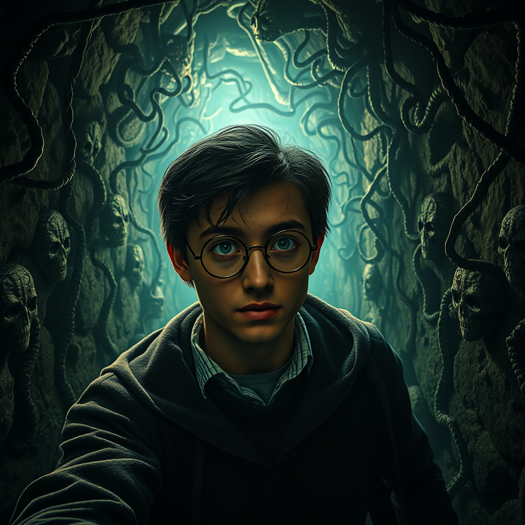 View this AI-generated image featuring harry potter descends into a nightmarish dungeon his glasses reflecting the eerie dynamic light that flickers from unseen sources the walls are alive with creeping sinewy forms reminiscent of h r giger s biomechanical artistry fused with jean ansell s mystical
