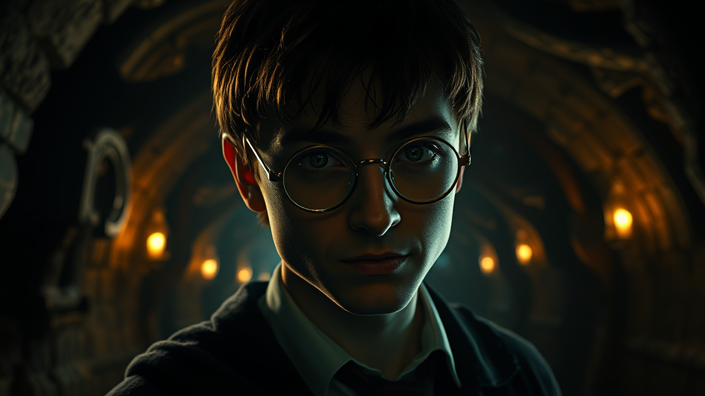 Harry Potter in a dark, eerie dungeon, a shiny, highly detailed and photorealistic scene, illuminated by dynamic, flickering light that casts long shadows; his glasses reflect a surreal, extreme nightmare version of reality; the environment is mystical and magical, with unsettling, biomechanical elements reminiscent of H. R. Giger, atmospheric and beautifully intricate touches inspired by Jean Ansell, and an enchanting, haunting quality akin to Justin Gerard's work; a chilling sense of unease pervades the air.