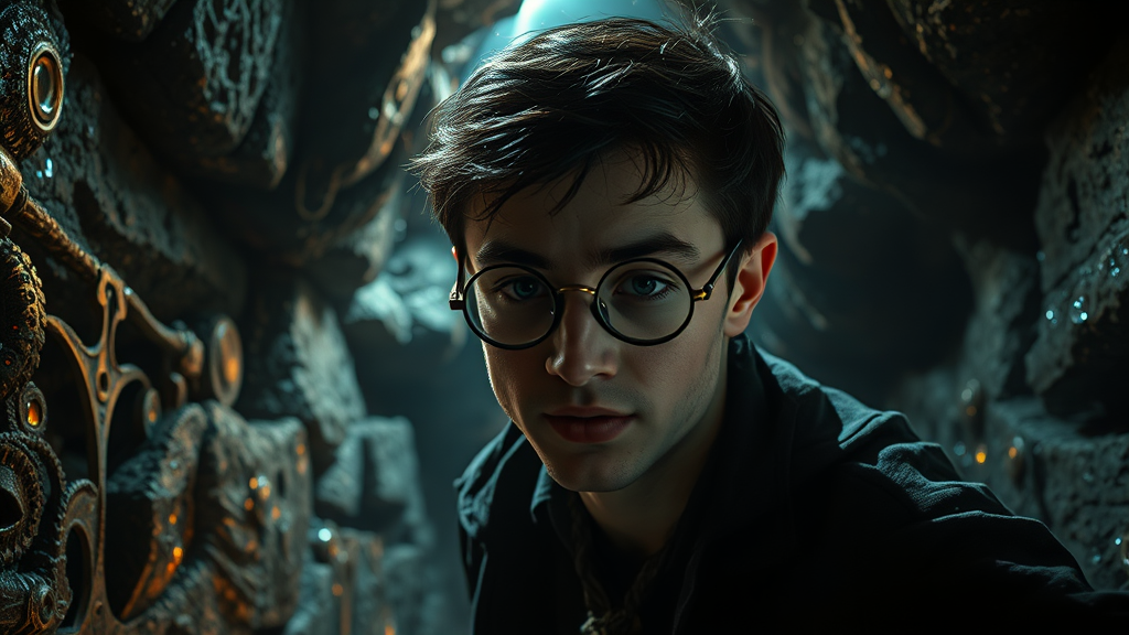 Harry Potter trapped in a dark, twisted dungeon, surrounded by eerie, shimmering surfaces that reflect dynamic, otherworldly light. His glasses catch the glow, casting ominous shadows across the stone walls. The scene is an extreme nightmare vision, blending mystical and magical elements with a haunting, surreal atmosphere. The environment is an uncanny fusion of H. R. Giger's biomechanical horror, Jean Ansell's intricate, dream-like details, and Justin Gerard's fantastical storytelling. Mysterious, creepy shapes loom in the darkness, adding an unsettling depth to the photorealistic and highly detailed composition.