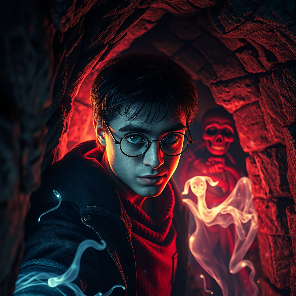 Harry Potter trapped in a dimly lit dungeon, surrounded by an eerie glow that casts intricate shadows on the ancient stone walls, his glasses reflecting the dynamic light. The scene is highly detailed and photorealistic, with an extreme nightmare version twist. Magical energies pulse around him, merging the mystical with the creepy. The atmosphere evokes a fusion of H. R. Giger's biomechanical surrealism, Jean Ansell's intricate fantasy elements, and Justin Gerard's vibrant world-building. Ghostly apparitions linger, their translucent forms adding a chilling touch to the dark, enchanted setting.