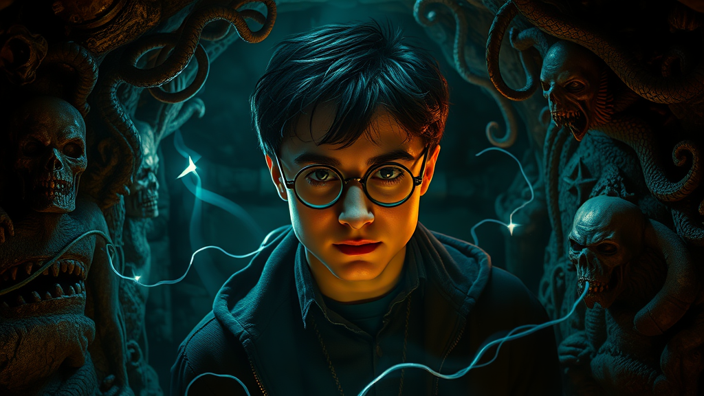 Harry Potter trapped within a dimly lit dungeon, his glasses reflecting an eerie, otherworldly glow; the atmosphere thick with mystical energy and creeping shadows. The walls are adorned with intricately carved, grotesque figures reminiscent of H. R. Giger's otherworldly biomechanical forms, intertwined with the fantastical, whimsical elements akin to Jean Ansell and Justin Gerard. The air hums with an unsettling, sinister vibe, as tendrils of dark magic weave around like serpents, casting dynamic light patterns across Harry's determined, yet unnerved face. The scene pulses with a surreal, nightmarish energy, encapsulating the essence of a mystical world teetering on the edge of reality and the unknown.