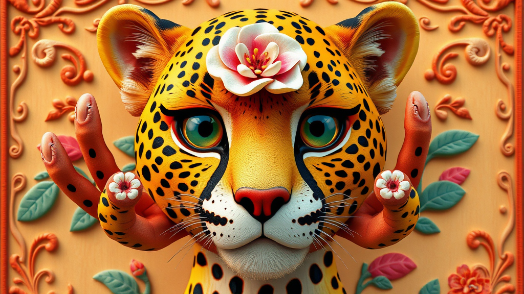 hasdx style, glazed 3D render, a cheetah with classical floral elements emerging elegantly from the center of its face, depicted as a woodcutting template in a decorative design; rendered in Pixar and Disney's enchanting styles. Vibrant and unusual colors cascade through an 8k resolution on a beautiful canvas frame, capturing a cartoonish, yet detailed 3D essence. A whimsical touch adds surreal elements like extra fingers and mutated hands, while maintaining a sense of artistic fluidity. The composition flirts with digital eccentricitiesâblurring and cloning effectsâinfusing it with quirky charm. Despite awkward proportions and whimsical mutations, the piece holds a playful allure, reminiscent of experimental video game art. Though the anatomy appears chaotic, this creative piece embraces its bizarre nature, offering a visually intriguing and avant-garde masterpiece.
