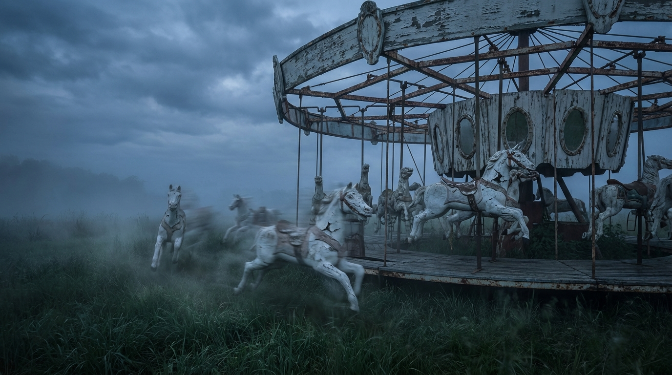 An eerie, weathered carousel stands in an overgrown field under a heavy, blue-grey sky. Several ornate white carousel horses appear to run off the carousel and into the surrounding fog, creating a melancholic and dreamlike atmosphere.