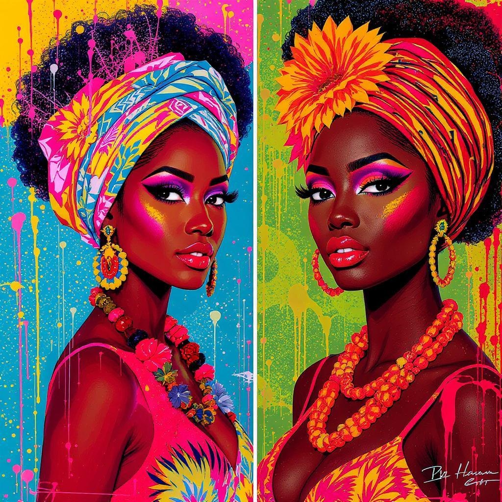 Hawaiian and African fusion, contemporary portrait series showcasing African women adorned in vibrant attire, featuring dynamic and bold digital illustrations with striking shadows and airbrush techniques. Emphasizing close-up perspectives, the art bursts with pop culture colors, presented in ultra HD comic art style, capturing a unique cultural blend with an elevated creative flair.