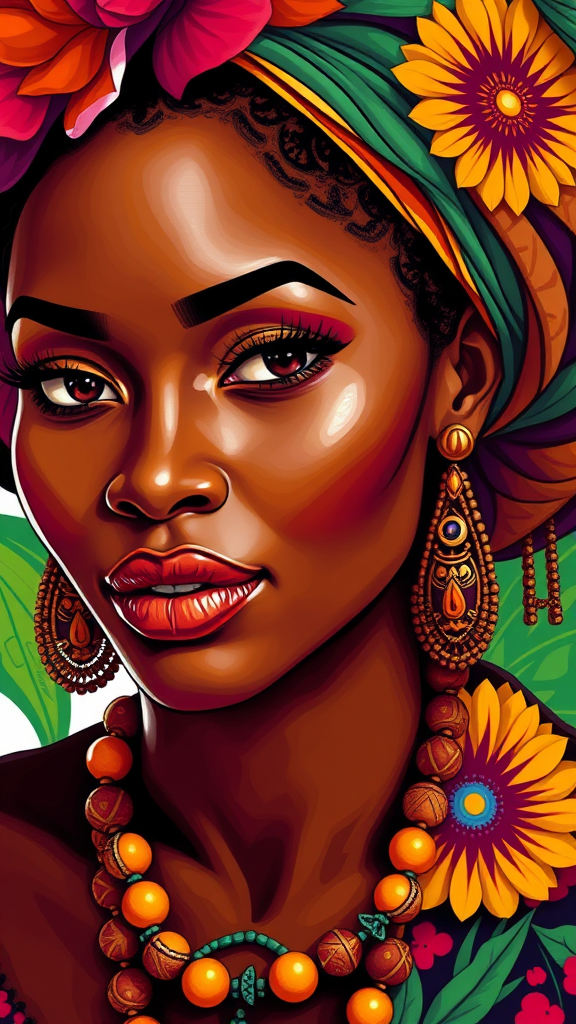 Hawaiian artists, contemporary portrait series of African women adorned in vibrant attire, in the style of dynamic digital illustration, strong contrasts, airbrush technique, close-up composition, vivid pop art color scheme, ultra high definition, comic-style art, showcasing bold expressions and cultural richness.