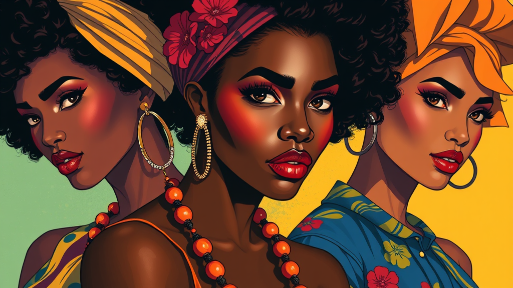 Hawaiian artists depicting modern African women in vibrant attire, featuring an assertive digital illustration style with striking shadows and airbrush techniques, focusing on close-up details. The series uses a pop art color palette, rendered in ultra-high definition with a comic art influence, maintaining a unique artistic interpretation.
