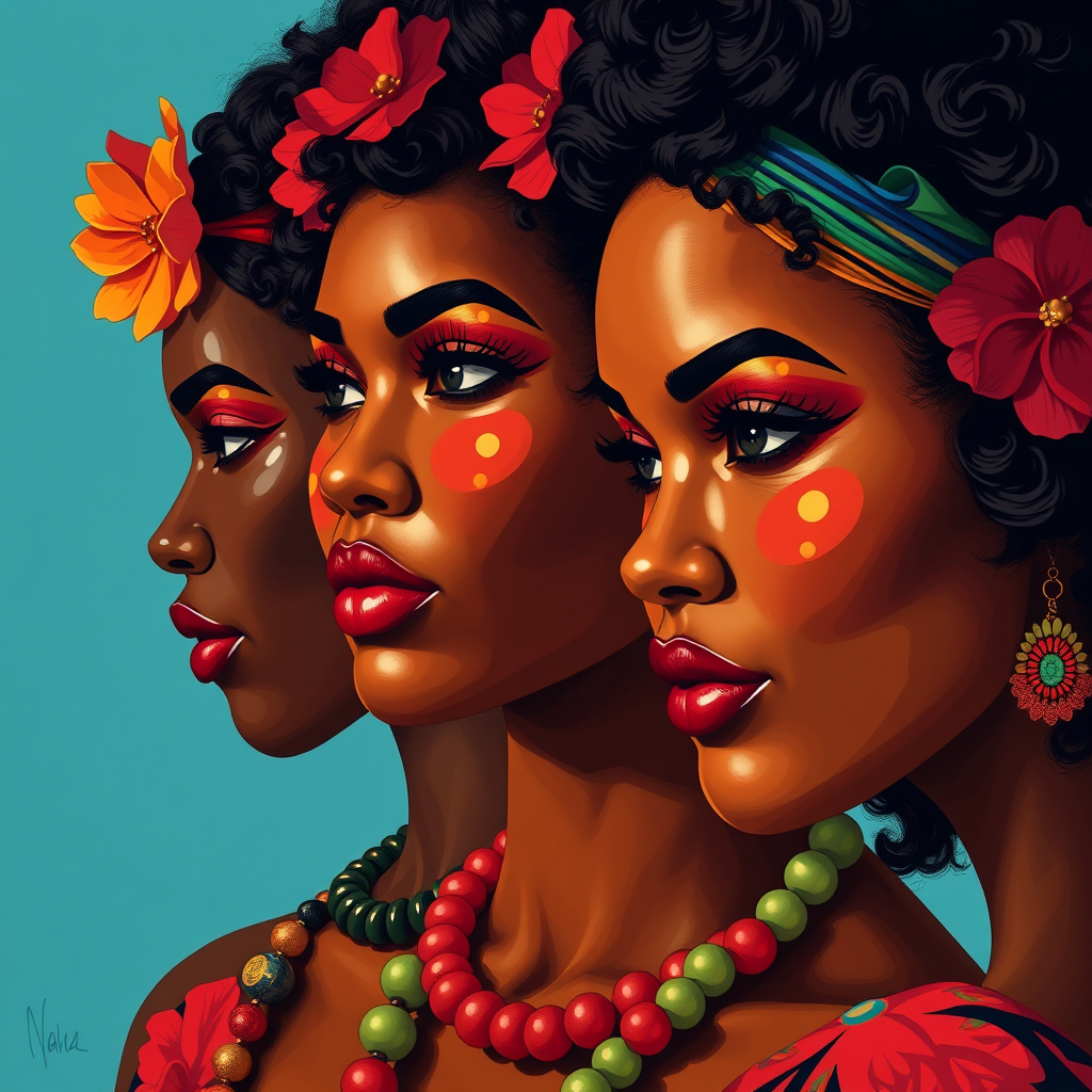 Hawaiian artists' influence on a contemporary portrait series featuring African women in vibrant attire, executed in an assertive digital illustration style with dramatic shadows, airbrush technique, and close-up perspectives. Utilize a pop art color palette, ultra-high-definition clarity, and elements of comic art for striking visual impact.
