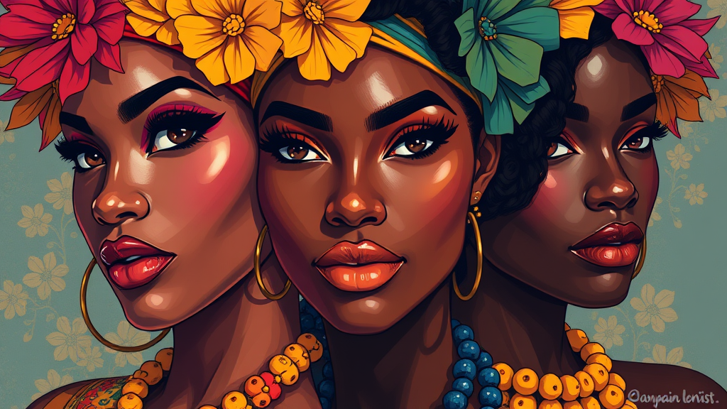 Hawaiian artists infused with a contemporary portrait series of African women adorned in vibrant attire, depicted through dynamic digital illustration featuring strong shadows and airbrush techniques, close-up perspectives, integrating a pop art color palette, ultra high definition quality, with a comic art flair and vertical orientation, stylized meticulously to enhance visual impact.