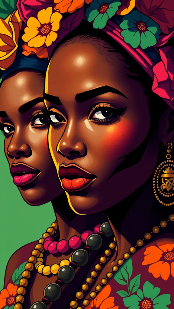 Hawaiian artists-inspired modern portrait series of African women adorned in vibrant attire, portrayed through dynamic digital illustration with striking shadows and airbrush techniques. The focus is on close-up views, utilizing a vivid pop art color palette and ultra high-definition comic art style.