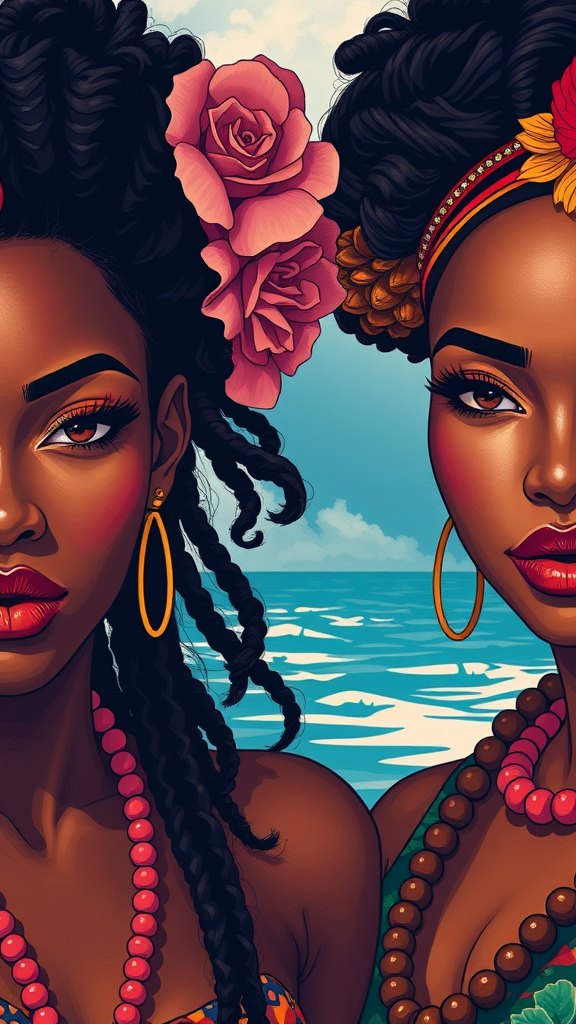 Hawaiian artists-inspired modern portrait series of African women in vibrant attire, featuring dynamic digital illustration, striking shadows, airbrush technique, close-up perspective, pop art color palette, ultra high definition, comic book art essence, with vertical orientation and heightened stylization.