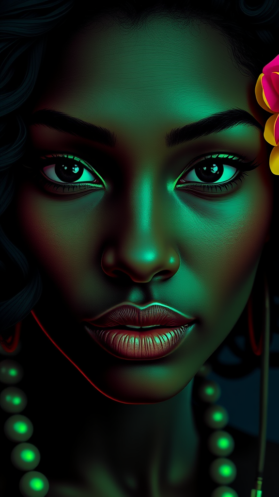 Hawaiian artists, modern portrait series of African-Arab and Afro-Latina women, in the style of hyper-realistic digital illustration, statement black and neon green shadows, graphic 3D airbrush effects, high-contrast close-up, pop art palette with fintastic neon colors, 8k ultra HD, comic book inspired action lines, portrait orientation, high-volume texture and brush strokes, stylize 800, gamma correction 6, halftone textures, vivid color tone correction.