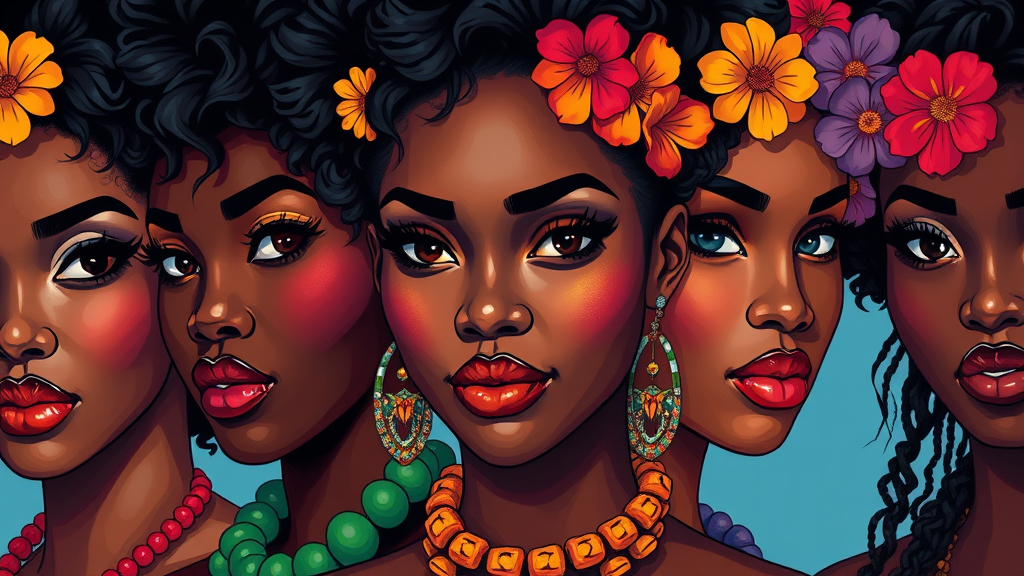 Hawaiian creators, contemporary portrait collection of African women in vibrant attire, crafted in a striking digital illustration style, with dramatic shadows, smooth airbrush technique, detailed close-ups, utilizing a vivid pop art color scheme, ultra high definition, dynamic comic art aesthetic, showcasing cultural fusion and artistic innovation