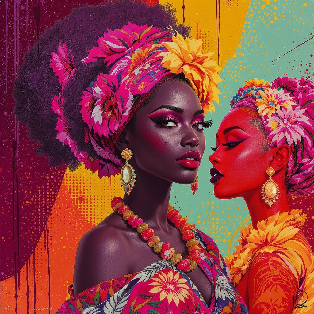 Hawaiian influence with modern portraits of African women adorned in vibrant attire, captured through dynamic digital illustration, featuring bold shadows and airbrush techniques. Close-up perspectives reveal striking details in a pop art color palette, rendered in ultra high definition with a touch of comic art flair. Unique variations add creative depth, maintaining the core essence of cultural vibrancy and artistic expression.