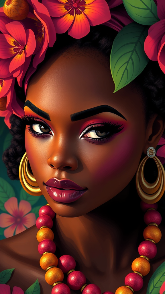 Hawaiian-inspired artists, contemporary portrait series of African women adorned in vibrant attire, crafted in an assertive digital illustration style with dynamic shadows and airbrushed techniques, featuring close-up compositions and a pop art color palette. Ultra-high definition with a comic art influence, aspect ratio 1:2, highly stylized with a touch of surrealism, version 6.