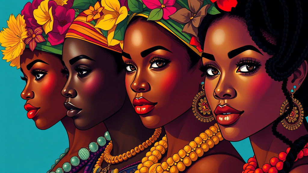 Hawaiian-inspired artists showcasing a modern portrait series of African women adorned in vibrant attire, crafted in an assertive digital illustration style featuring distinct shadows and airbrush techniques. Emphasize close-up perspectives with a pop art color palette, rendered in ultra HD and infused with a comic art aesthetic, highlighting the beauty and strength of each subject.