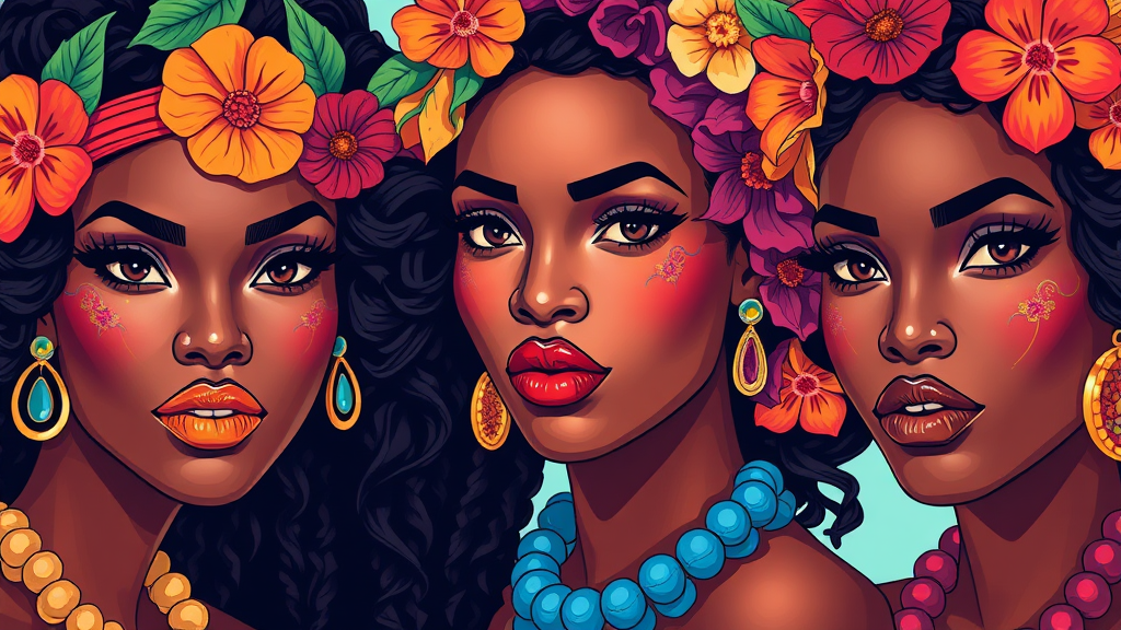 Hawaiian-inspired creators, contemporary portrait series of African women adorned in vibrant attire, rendered in dynamic digital illustration style, featuring striking contrasts and airbrush techniques, with a focus on close-up details, utilizing a pop art color scheme, ultra-high definition, and comic art influences, aspect ratio 1:2, with an elevated stylistic flair.