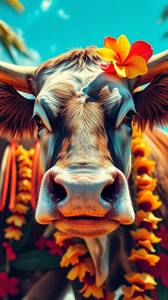 Hawaiian-inspired modern portrait series featuring Nelore cattle dressed in vibrant attire, rendered in an intense digital illustration style with dynamic shadows and airbrush-like textures. The close-up composition showcases a pop art color palette, ultra high-definition detail, and a comic art vibe. Experiment with the interplay of colors and shadows to add depth and personality, capturing the cattle's essence in an imaginative way.