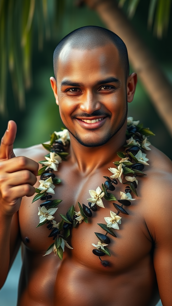 Hawaiian man in traditional Hawaiian attire, exuding charisma and charm, with a handsome and muscular physique, engaging in a subtle flirtatious gesture while making direct eye contact with the viewer. Captured in a full-length portrait, this photograph showcases intricate details of his complexion with a photo-realistic quality in 8k resolution. The image embodies high detail and rich raw color tones, with a soft piercing that adds character. The composition features diffused soft lighting, a shallow depth of field, sharp focus, and hyper-realistic elements, all brought together with cinematic lighting that enhances the overall visual appeal.